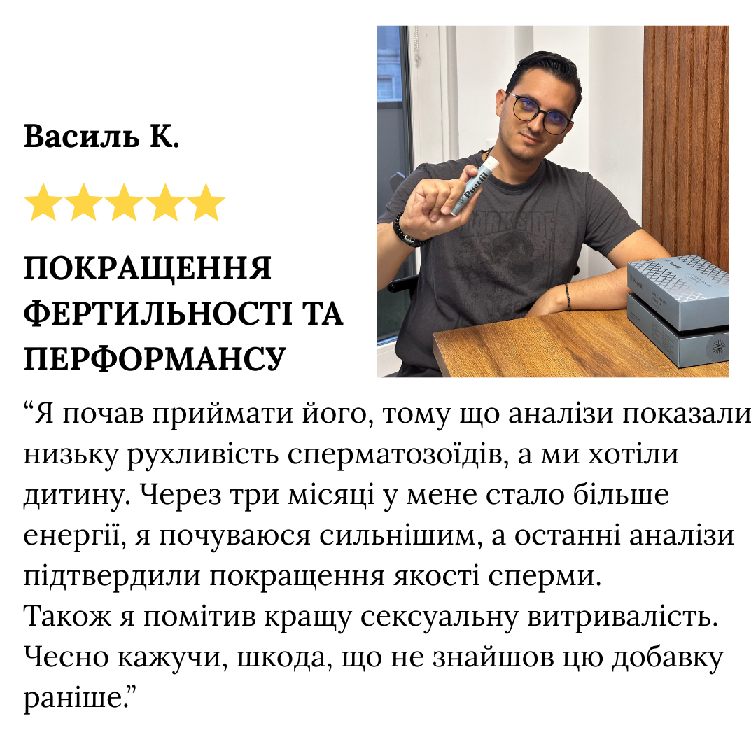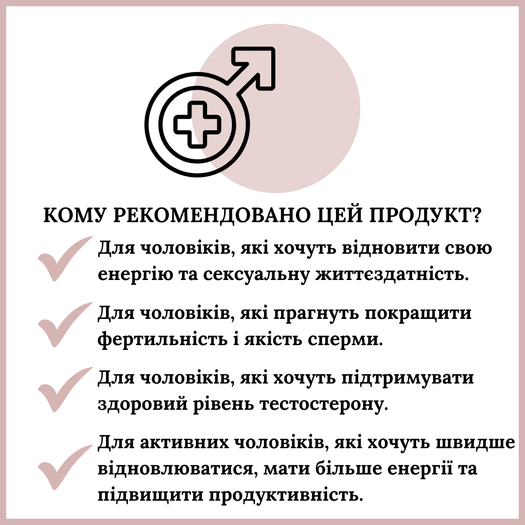 ✅ Покращує якість сперми та чоловічу фертильність, забезпечуючи організм необхідними поживними речовинами для здорової репродуктивної функції.