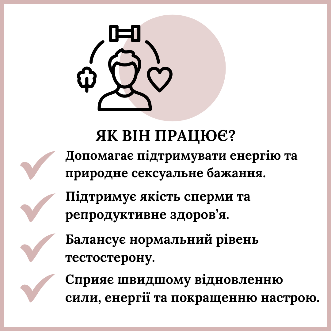✅ Допомагає підтримувати нормальний рівень тестостерону, щоб зберігати енергію, гарний настрій і силу в балансі.
