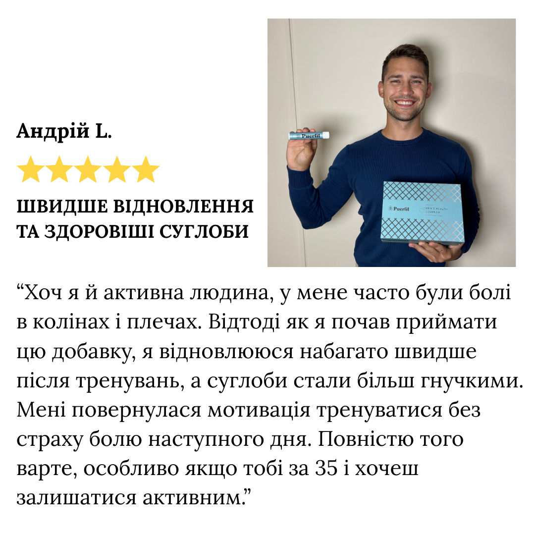 Підтримує рухливість суглобів, зменшує суглобовий дискомфорт і сприяє швидшому відновленню після навантаження.
